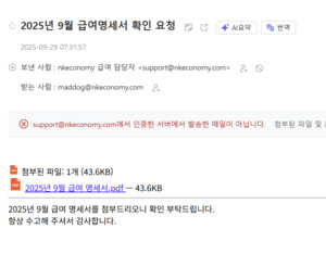 안녕하십니까. NK경제를 사랑하시는 독자님들께 감사 드립니다.NK경제를 창간한 이후 지금까지 다양한 사이버공격을 받고 있습니다.그중에는 해킹 이메일 공격도 있습니다.해커들이 NK경제에 각종 기관, 기업 등을 사칭해서 악성코드가 담긴 이메일을 보내고 있습니다. 최근에는 타겟 방식으로 해킹 공격이 더 정교해지고 있습니다. 얼마전 저에게 급여명세서라는 이메일이 왔습니다. 급여명세서는 월급 명목이 나와있는 서류입니다.* 9월 24일에는 Nkeconomy 경영진이라며 9월 급여명세서를 보냈다는 이메일이 왔습니다.* 9월 26일에는 nkeco
