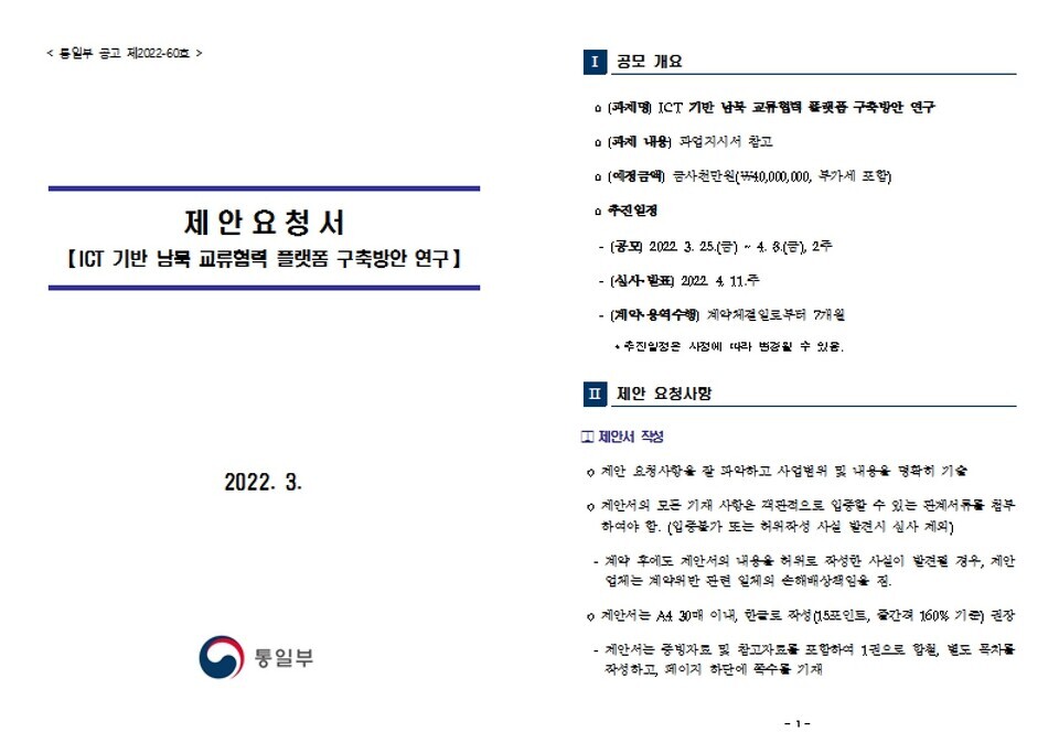 제안요청서에 따르면 통일부는 4차 산업혁명을 대비한 새로운 미래 지향적 남북경제협력 모델을 발굴하고 남북의 강점인 ICT 기술을 바탕으로 남북 간 경제협력을 제고할 수 있는 경제협력 모델 만들기 위해 이번 사업을 추진한다.