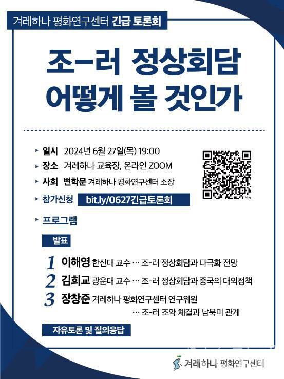 시민단체 겨레하나 평화연구센터가 6월 27일 19시 겨레하나 교육장과 온라인에서 '조(북)-러 정상회담, 어떻게 볼 것인가'를 주제로 토론회를 연다.