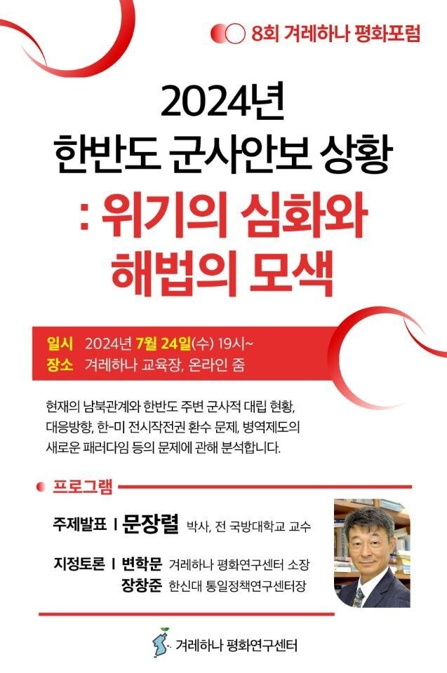 이번 행사는 '2024년 한반도 군사안보 상황 : 위기의 심화와 해법의 모색'을 주제로 열린다. 현재의 남북 관계와 한반도 주변 군사적 대립 현황, 대응방향, 한-미 전시작전권 환수 문제, 병역제도의 새로운 패러다임 등에 관해 전문가들이 분석한다.