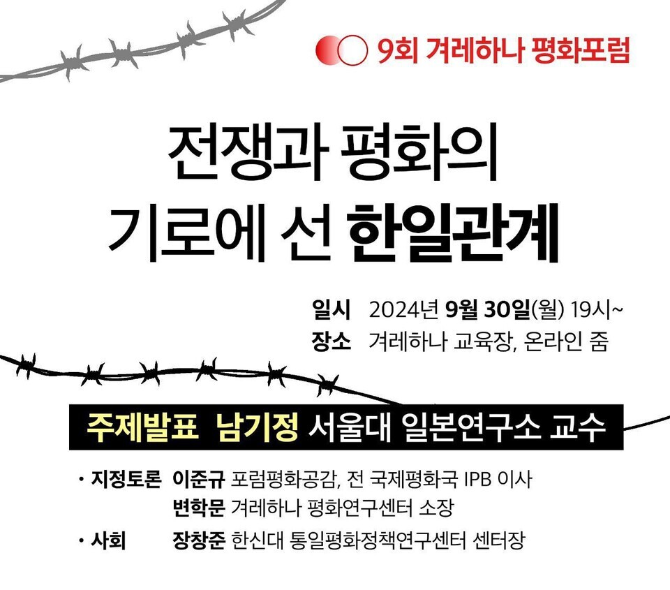 이번 행사는 '전쟁과 평화의 기로에 선 한일관계'를 주제로 열린다. 남기정 서울대 일본연구소 교수가 주제 발표를 하고 장창준 한신대 통일평화정책연구센터 센터장이 사회를 맡는다.