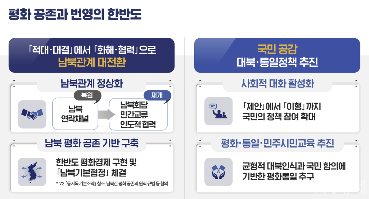 이재명 정부는 화해, 협력의 남북 관계 재정립 및 평화공존 제도화와 국민이 공감하는 호혜적 남북교류협력을 추진한다. 또 분단고통 해소와 인도적 문제 해결, 국민과 함께 하는 한반도 평화 및 통일 정책 추진, 한반도 평화경제 및 공동성장의 미래 준비, 북핵 문제 해결과 한반도 평화체제를 향한 실질적 진전을 추구하기로 했다.