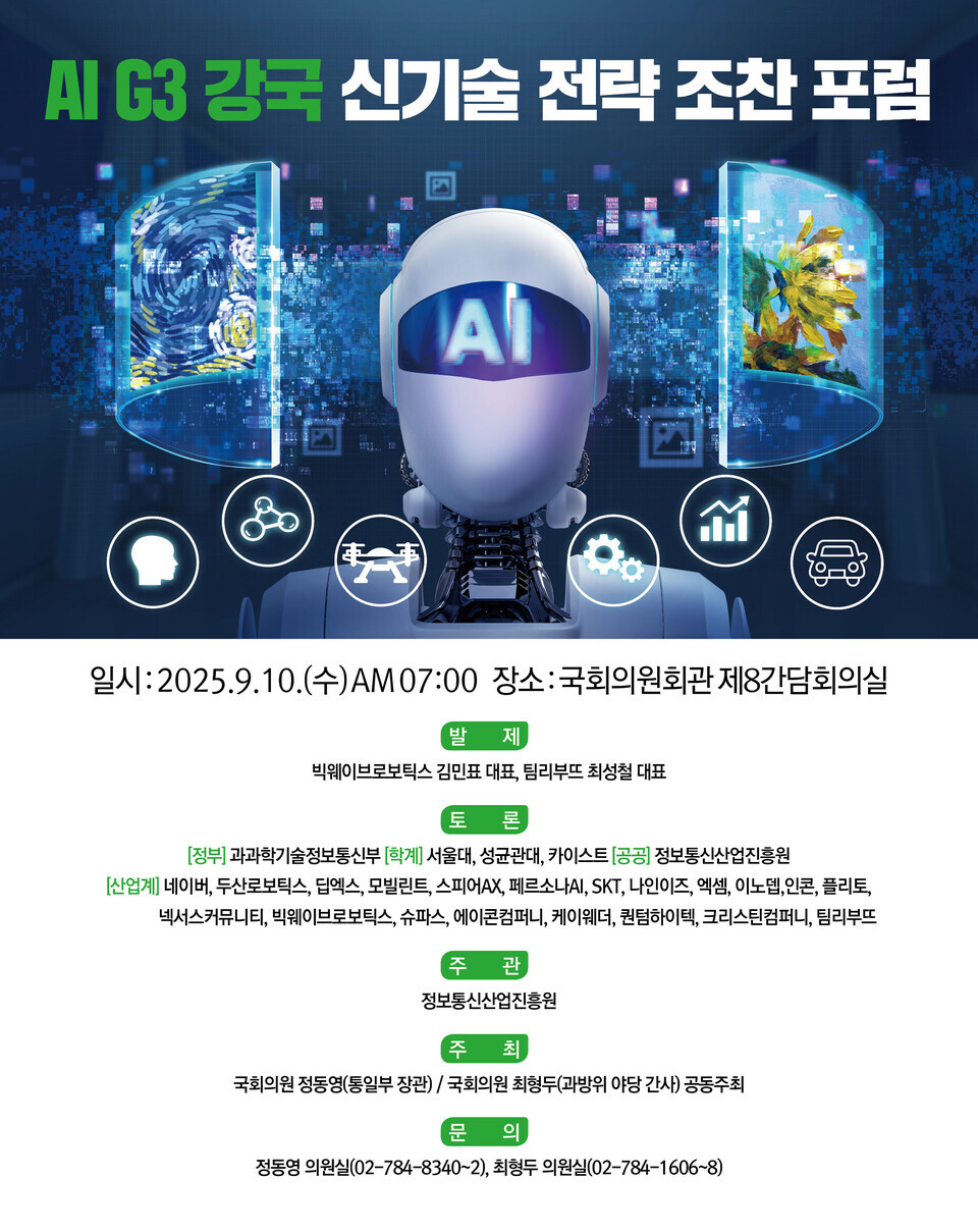 정동영 통일부 장관이 국민의힘 최형두 의원과 9월 10일 국회 의원회관 제8간담회의실에서 인공지능(AI) G3 강국 신기술 전략 조찬 모럼을 연다.