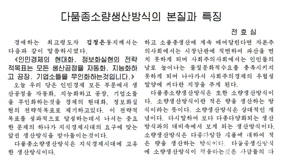 이 글은 “모든 기업체들에서는 다품종소량생산방식의 본질과 특징을 잘 알고 그것을 널리 받아들여 지식경제시대의 요구에 맞게 생산공정의 현대화, 정보화를 다그치며 나라의 경제발전과 인민생활 향상에 적극 이바지해야 한다”고 주장했다.