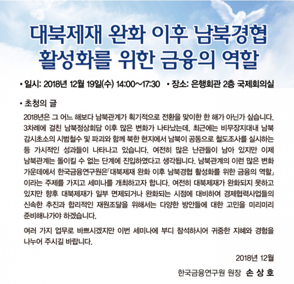 한국금융연구원은 12월 19일 오후 서울 명동 은행회관 국제회의실에서 '대북 제재 완화 이후 남북경협 활성화를 위한 금융의 역할'을 주제로 세미나를 개최한다고 공지했다.