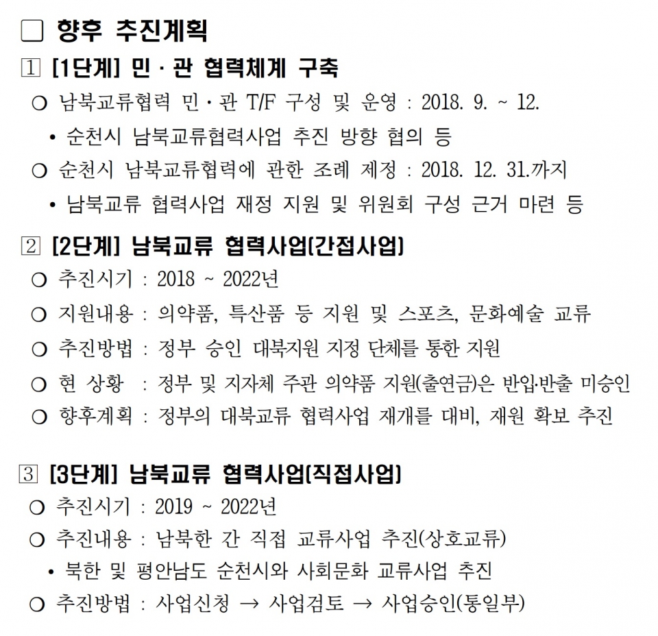 순천시는 올해말까지 남북교류협력 조례 등을 제정하고 관련 조직과 법령을 정비한다. 내년부터는 북한과 의약품 제공, 특산품 교환 및 스포츠, 문화예술 사업 교류에 나선다.