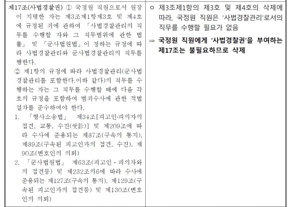 국가정보원법 개정법률안 검토의견서에 따르면 개정안에는 국가정보원에 수사권을 부여하는 내용을 담고 있다. 국정원은 과거 대공수사권을 갖고 있었다. 하지만 이명박, 박근혜 정부 시절 국정원이 민간인 사찰, 정치개입, 댓글사건 등 문제를 일으키면서 문재인 정부에서는 수사권을 조정한 바 있다.