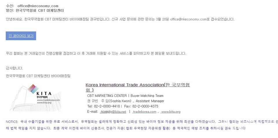 3월 29일 NK경제 공용 이메일과 대표이사 이메일로 한국무역협회 직원이라며 신규 사업에 대한 문의가 접수됐다는 이메일이 왔습니다.