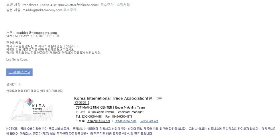 이메일은 이성경이라는 사람이 회사 프로필을 보고 제품에 관심이 있는 것처럼 가장했습니다. NK경제는 한국무역협회에 회사 프로필을 등록한 적이 없습니다.