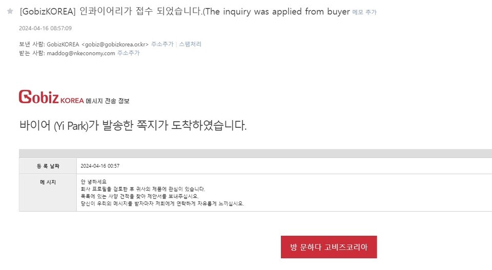 이메일은 메시지가 있다며 확인을 요청하는 것처럼 링크 클릭을 유도했는데 해당 링크는 한국의 고비즈코리아가 아니라 미상의 홍콩 사이트로 연결되는 것이었습니다.