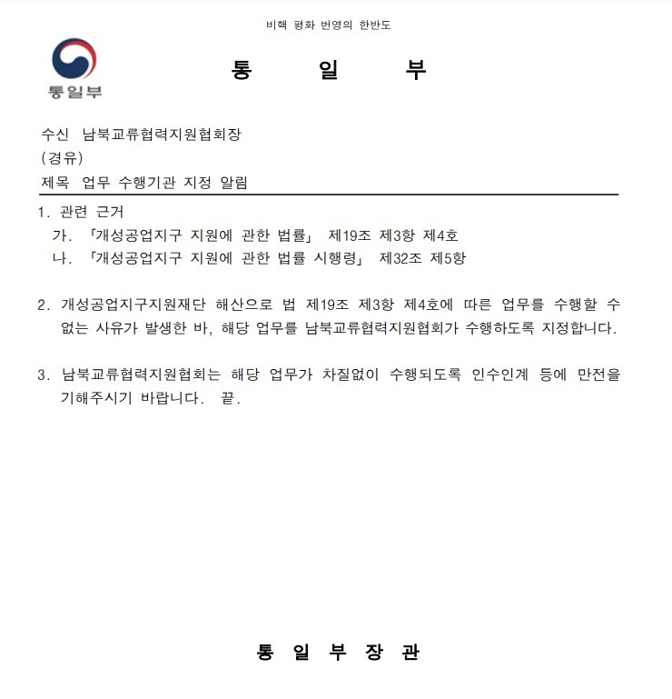 통일부는 개성공업지구 지원법과 시행령을 근거로 개성공업지구지원재단 해산으로 업무를 수행할 수 없게 됐으니 협회가 해당 업무를 수행하라고 설명했다.