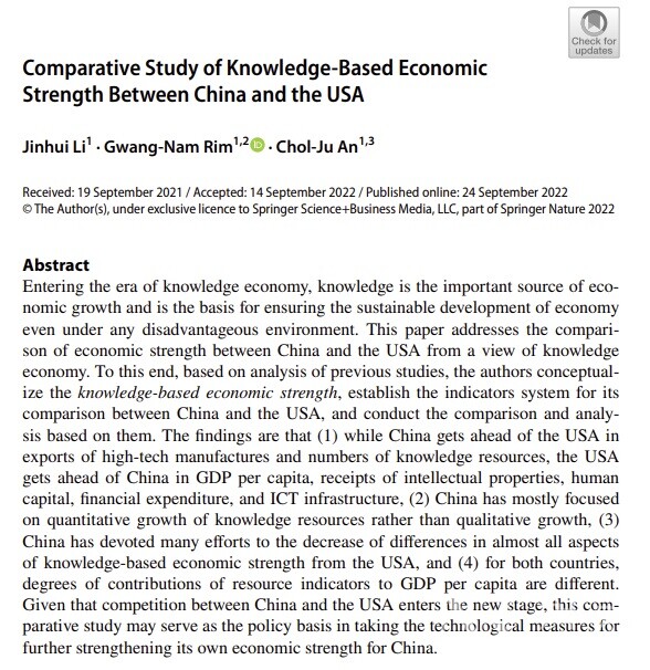 대북 소식통에 따르면 2022년 국제 학술지 지식경제저널(Journal of the Knowledge Economy)에 ‘중국과 미국의 지식기반 경제력 비교 연구(Comparative Study of Knowledge‑Based Economic Strength Between China and the USA)’라는 논문이 수록됐다.