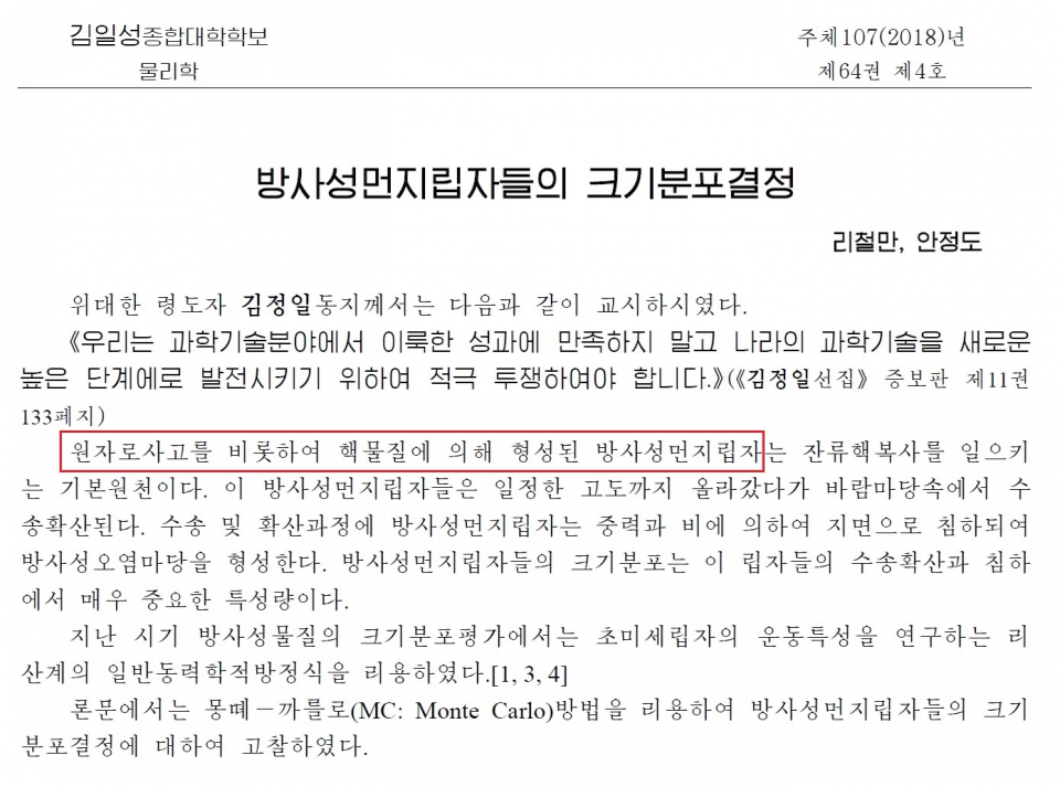 4월 12일 대북 소식통에 따르면 북한 김일성종합대학은 김일성종합대학학보 물리학 2018년 제64권 제4호에 '방사성 먼지 립자들의 크기분포결정'이라는 논문을 수록했다.