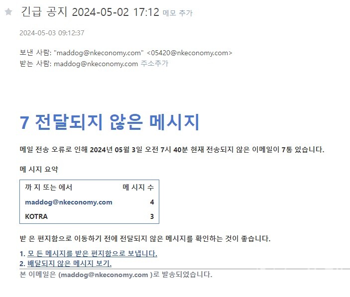 5월 3일 오전에 NK경제 대표이사 이메일 계정으로 긴급 공지라는 제목의 이메일이 수신됐습니다. 긴급 공지라는 이메일을 보낸 것은 NK경제라고 쓰여 있었습니다.
