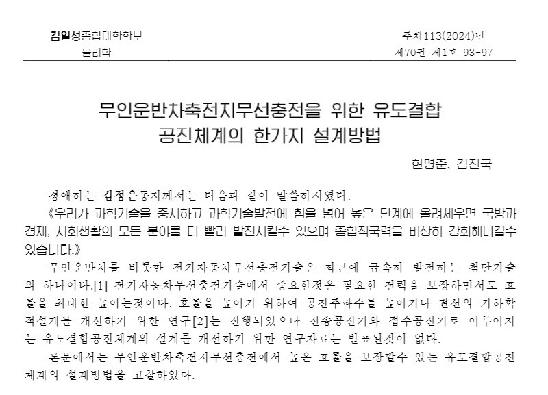 대북 소식통에 따르면 김일성종합대학 학보 물리학 2024년 제70권 제1호에 ‘무인운반차축전지 무선충전을 위한 유도결합 공진 체계의 한 가지 설계방법’라는 논문이 수록됐다.
