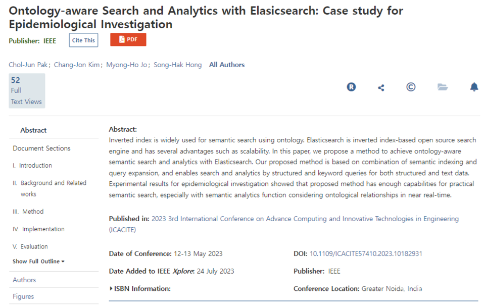 대북 소식통에 따르면 김일성종합대학은 최근 홈페이지를 통해 정보과학부 사물인터네트(사물인터넷, IoT)기술연구소에서는 대자료(빅데이터)에 대한 의미검색을 실현하기 위해 엘라스틱서치(Elasticsearch)를 이용해 온톨로지를 고려한 검색 및 분석을 실현하는 방법을 개발했다고 밝혔다.