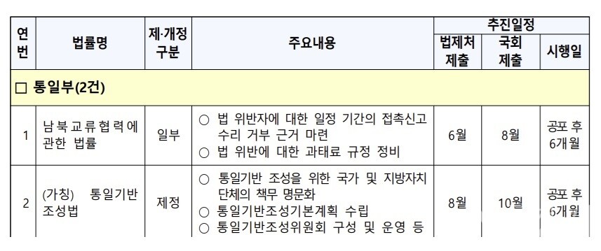 또 통일부는 남북교류협력에 관한 법률 일부 개정안도 추진한다. 개정되는 법안에는 법 위반자에 대한 일정 기간의 접촉신고 수리 거부 근거가 마련되면 법 위반에 대한 과태료 규정도 정비된다. 통일부는 법제처 개정안 검토 후 8월 국회에 제출할 예정이다.