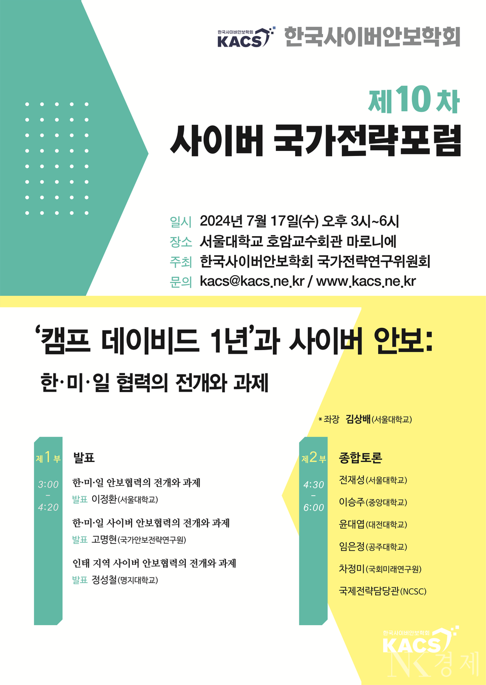 한국사이버안보학회(KACS)는 7월 17일 서울대학교 호암교수회관 마로니에에서 ‘캠프 데이비드 1년과 사이버안보: 한·미·일 협력의 전개와 과제’를 주제로 제10차 사이버 국가전략포럼을 개최한다.