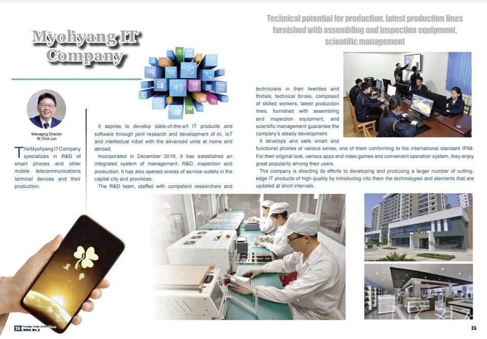 북한 영어 잡지 해외무역(Foreign Trade) 2024년 3호는 스마트폰 등 이동통신 단말기 연구개발과 생산을 전문으로 하는 IT 기업 묘향IT기업을 소개했다.