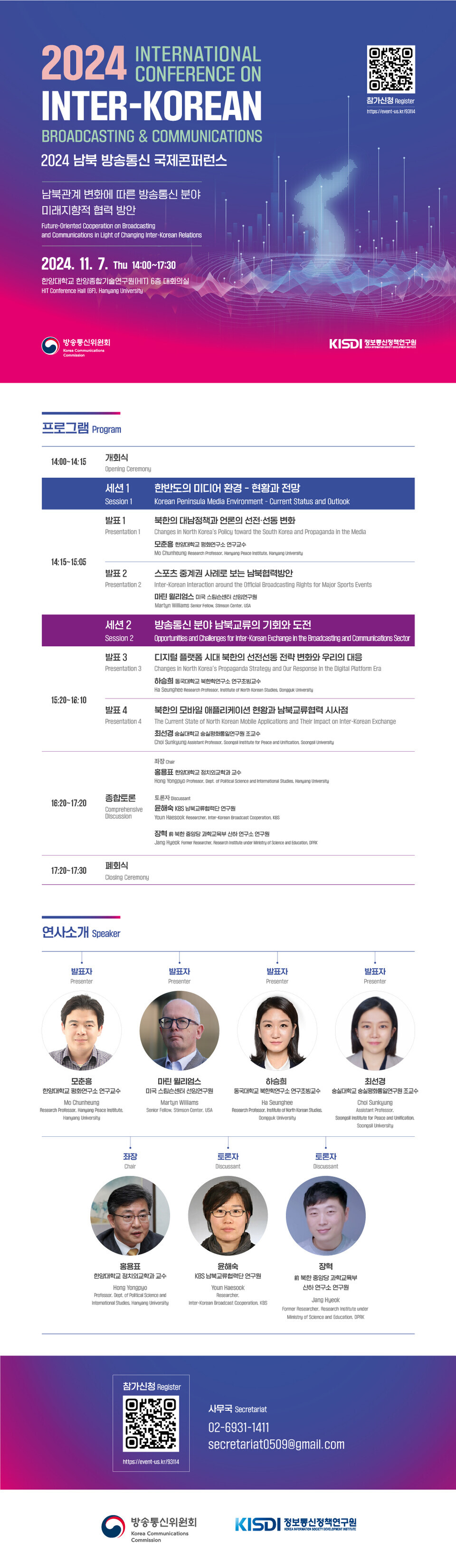 방송통신위원회와 정보통신정책연구원(KISDI)이 11월 7일 한양대학교 한양종합기술연구원 대회의실에서 '남북 관계 변화에 따른 방송통신 분야 미래지향적 협력 방안'을 주제로 2024 남북 방송통신 국제컨퍼런스를 개최한다.