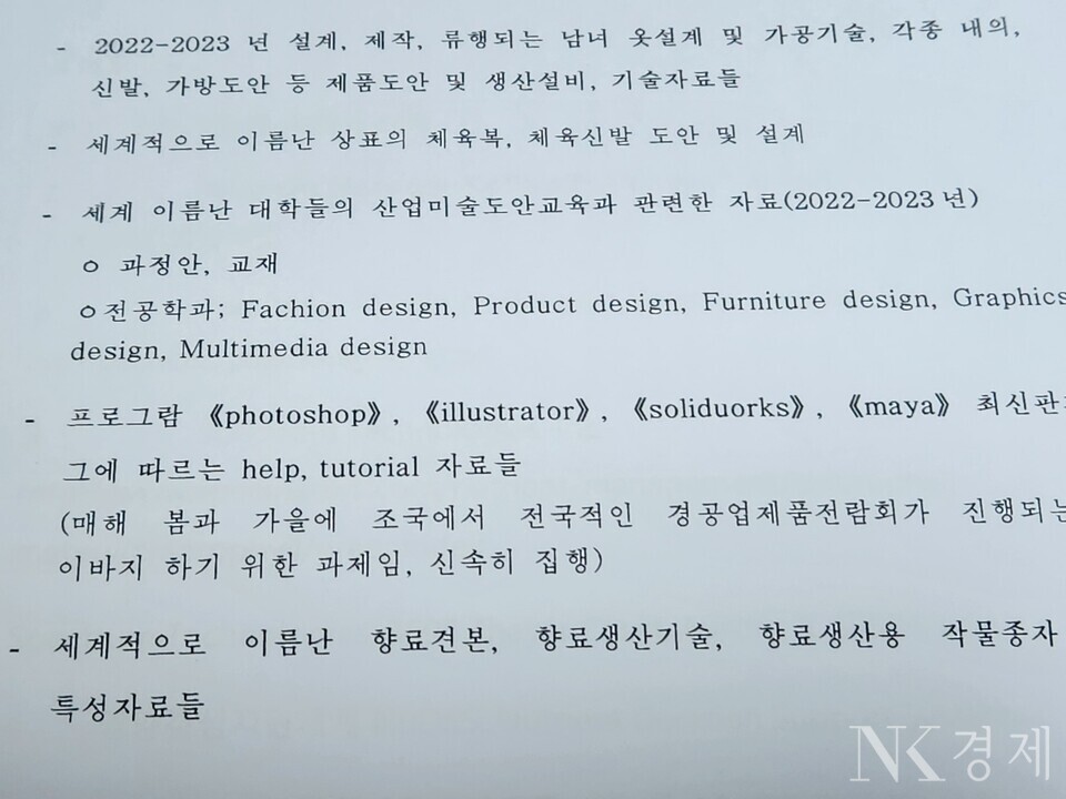 특히 세계적으로 이름난 상표의 체육복, 체육신발 도안 및 설계 정보와 세계 이름난 대학들의 산업미술도안교육과 관련한 자료도 요청했다.
