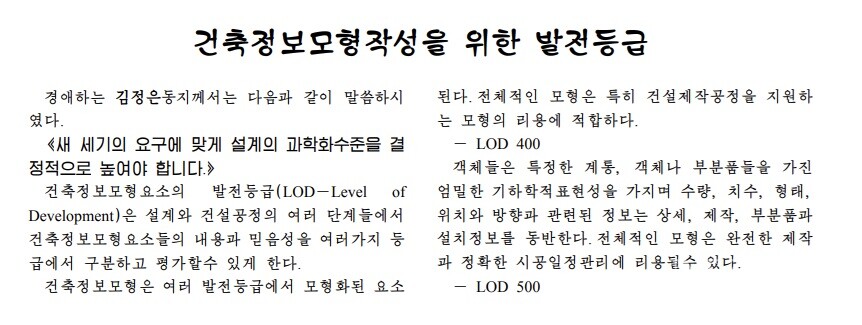 조선건축은 “건축정보모형요소의 발전등급(LOD, Level of Development)은 설계와 건설공정의 여러 단계들에서 건축정보모형요소들의 내용과 믿음성을 여러 등급에서 구분하고 평가할 수 있게 한다”고 설명했다.