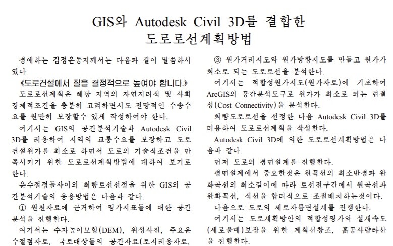 조선건축은 “도로 노선 계획은 해당 지역의 자연지리적 및 사회 경제적 조건을 충분히 고려하면서도 전망적인 수송수요를 원만히 보장할 수 있게 작성해야 한다”며 “지리정보시스템(GIS)의 공간분석기술과 오토데스크 시빌(Autodesk Civil) 3D를 이용해 지역의 교통수요를 보장하고 도로건설원가를 최소로 하면서 도로의 기술적 조건을 만족시키기 위한 도로 노선 계획 방법에 대해 알아 보기로 한다”고 설명했다.