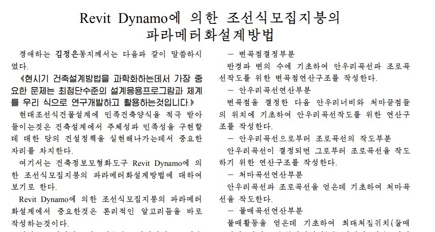 조선건축은 “현대 조선식 건물 설계에 민족건축양식을 적극 받아들이는 것은 건축설계에서 주체성과 민족성을 구현하려는 당의 건설정책을 실현해 나가는데 중요한 자리를 차지한다”며 “여기서는 건축정보모형화 도구 Revit Dynamo에 의한 조선식 모집 지붕의 파라메터화 설계 방법에 대해 알아본다”고 설명했다.