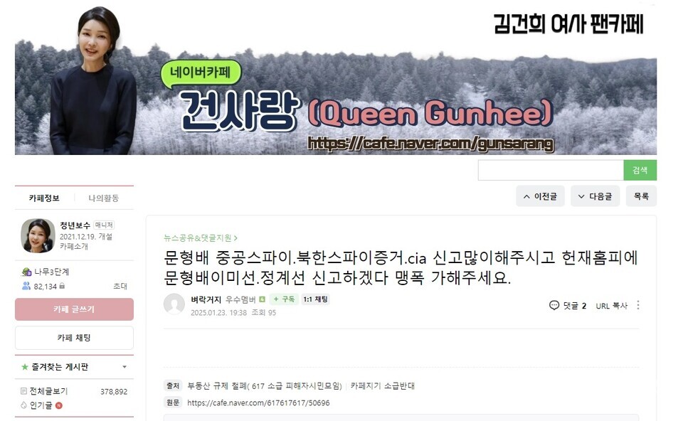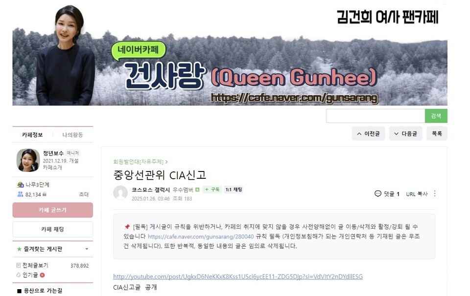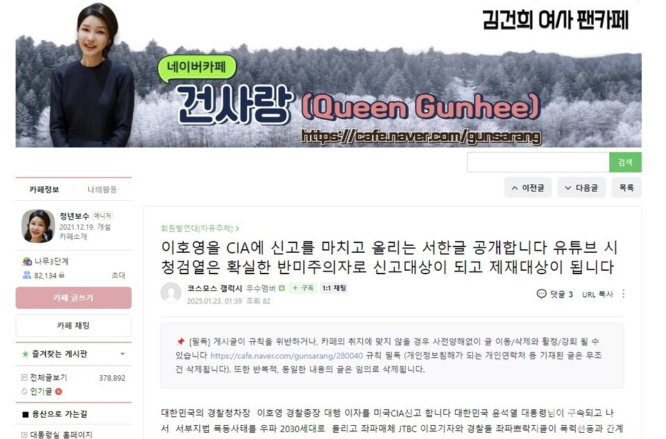 윤석열 대통령의 영부인 김건희씨의 팬클럽 '건사랑 퀸건희(김건희가 여왕이라는 뜻)'가 검찰, 경찰, 선거관리위원회, 헌법재판소 등의 관계자들을 미국 중앙정보국(CIA)에 신고해야 한다고 선동하고 있다.