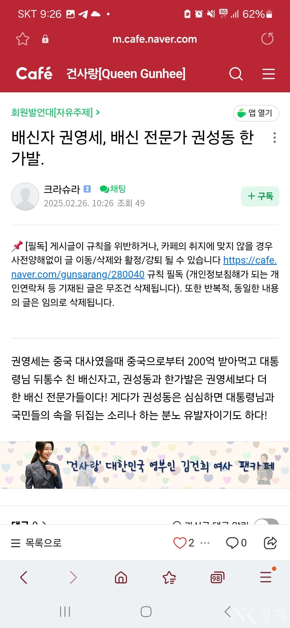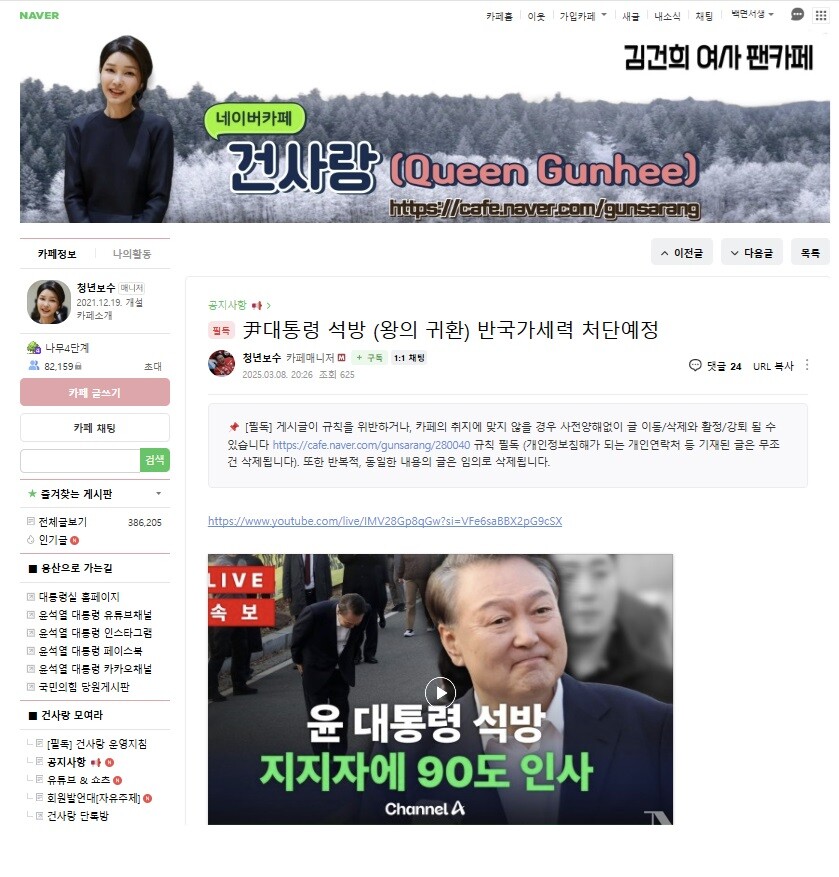 정치권 관계자들에 따르면 김건희씨의 팬카페 퀸건희에는 3월 8일 윤 대통령 석방 후 반국가세력을 처단할 예정이라는 글이 게재됐다. 이 내용은 단순히 팬카페 가입자가 쓴 것이 아니라 필독 공지사항으로 지정됐다.