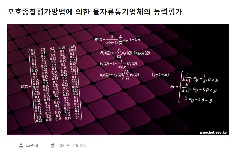 북한 김책공업종합대학은 홈페이지를 통해 대학 송광혁 공업경제관리학부 실장이 물자유통기업들의 능력을 평가하기 위한 방법을 제안했다고 3월 9일 밝혔다.