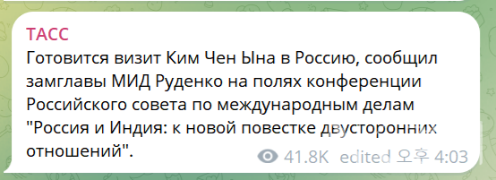 대북 소식통에 따르면 러시아 타스 통신은 3월 26일 안드레이 루덴코 러시아 외무차관이 러시아 국제문제위원회 회의에서 김정은 총비서의 러시아 방문이 준비되고 있다는 발언을 보도했다.