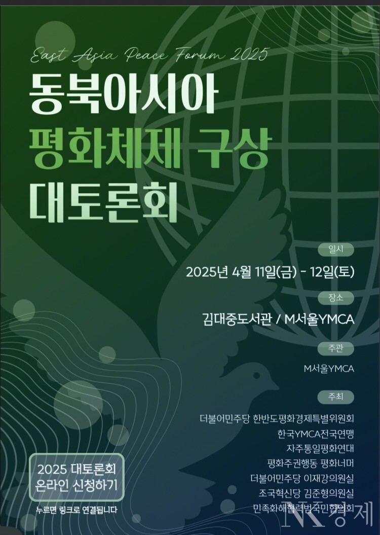 더불어민주당 한반도평화경제특별위원회, 한국YMCA전국연맹, 자주통일평화연대, 평화주권행동 평화너머, 더불어민주당 이재강 의원실, 조국혁신당 김준형 의원실, 민족화해협력범국민합의회는 4월 11일과 12일 김대중도서관에서 동북아 평화를 주제로 토론회를 연다.