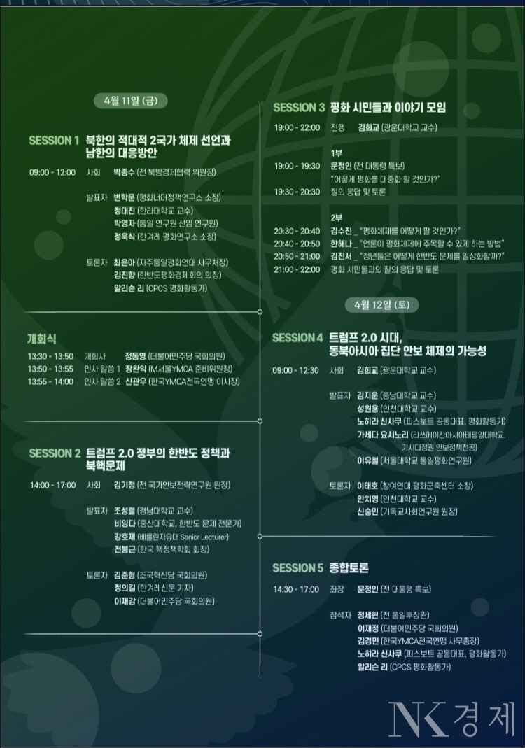 종합토론은 문정인 전 대통령 특보를 좌장으로 정세편 전 통일부 장관, 이재정 더불어민주당 의원, 김경민 한국YMCA전국연맹 사무총장, 노히라 신사쿠 피스보트 공동대표, 알리슨 리 CPCS 평화활동가가 참여한다.