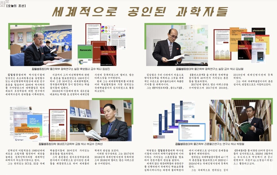 조선의출판사가 제작하는 북한 월간잡지 조선 2025년 4호가 세계적으로 공인된 북한 과학자들이라며 4명을 소개했다.