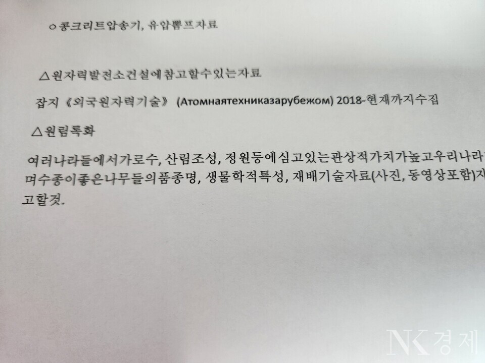 북한 당국은 원자력 발전소 건설에 참고할 수 있는 자료를 확보할 것을 지시했다. 구체적으로는 러시아 잡지 ‘외국 원자력 기술(Атомная техника за рубежом)’의 2018년 내용부터 최근 자료까지 확보해 북한으로 보내라고 요청했다.