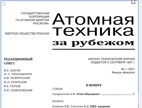 이 잡지는 1957년부터 발행되고 있으며 해외 주요 학술지 등의 원자력 과학, 기술 최신 논문, 이슈, 행사 자료 등을 분석해 러시아 과학자들에게 소개하는 잡지로 알려졌다.