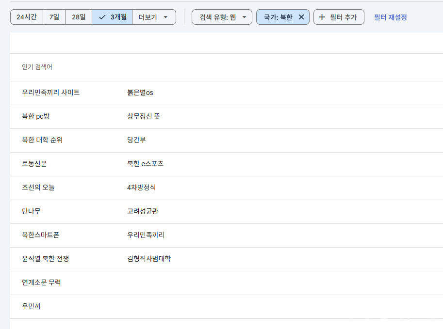 북한 IP 사용자들은 우리민족끼리 사이트, 북한 pc방, 북한 대학 순위, 로동신문, 조선의 오늘,단나무, 북한스마트폰, 윤석열 북한 전쟁, 연개소문 무력, 우민끼, 붉은별os, 상무정신 뜻, 당간부, 북한 e스포츠, 4차방정식, 고려성균관, 우리민족끼리, 김형직사범대학 등으로 검색했다.