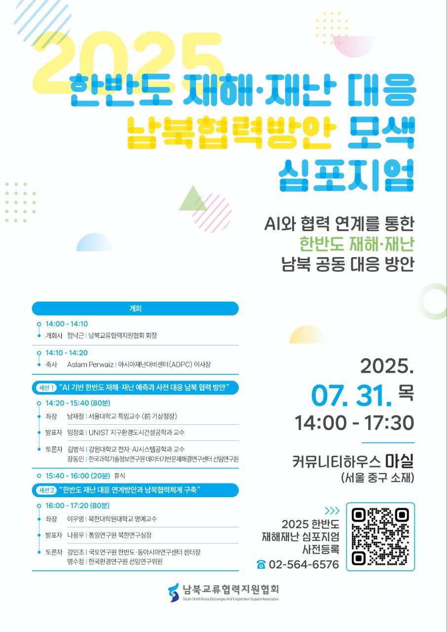 남북교류협력지원협회가 오는 7월 31일 오후 2시부터 서울 중국 커뮤니티하우스 마실에서 ‘한반도 재해·재난 대응 남북협력방안 모색 심포지엄’을 연다.