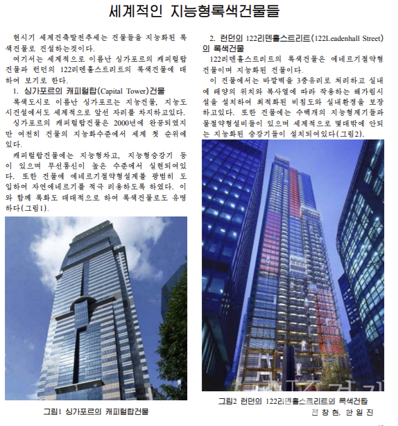 조선건축 2025년 2호는 녹색도시로 이름난 싱가포르가 지능건물, 지능도시건설에서도 세계적으로 앞선 자리를 차지하고 있다며 그중 캐피털 탑(Capital Tower) 건물은 2000년에 완공됐지만 여전히 건물의 지능화 수준에서 세계 첫 순위에 손꼽힌다고 설명했다.
