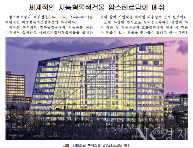 조선건축 2025년 3호는 네덜란드 암스테르담의 더 엣지 건물(The Edge, Amsterdam)이 세계적인 지능형 녹색 건물들 중 하나라고 설명했다. 녹색화 된 건축 공간들에서 지능화를 높은 수준에서 실현하고 에너지 절약형 설비들을 설치한 것과 함께 자연 빛을 최대한 이용할 수 있게 했다는 것이다.