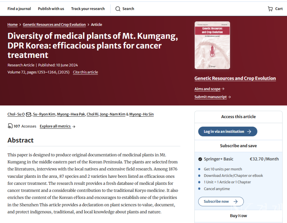 대북 소식통에 따르면 북한 김일성종합대학 연구진이 2024년 6월 학술지 ‘Genetic Resoueces and Crop Evolution’에 ‘Diversity of medical plants of Mt. Kumgang, DPR Korea-efficacious plants for cancer treatment’라는 논문을 투고했다.