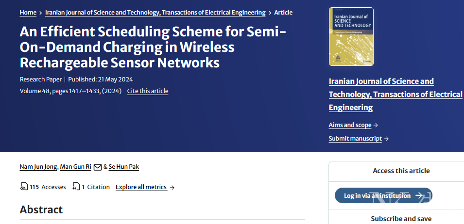 대북 소식통에 따르면 이란 과학기술 학술지 ‘Iranian Journal of Science and Technology, Transactions of Electrical Engineering’에 2024년 5월 ‘An Efficient Scheduling Scheme for Semi-On-Demand Charging in Wireless Rechargeable Sensor Networks’ 논문이 게재됐다.